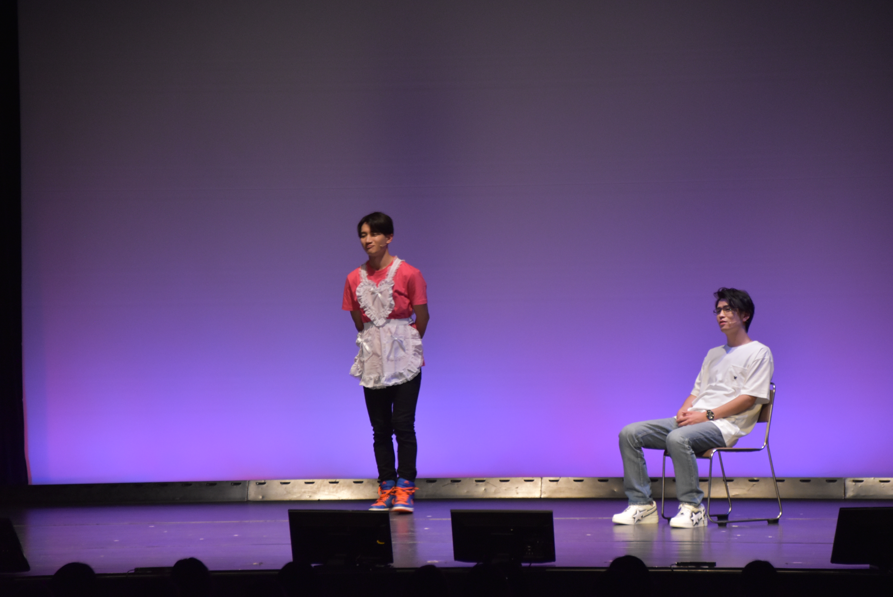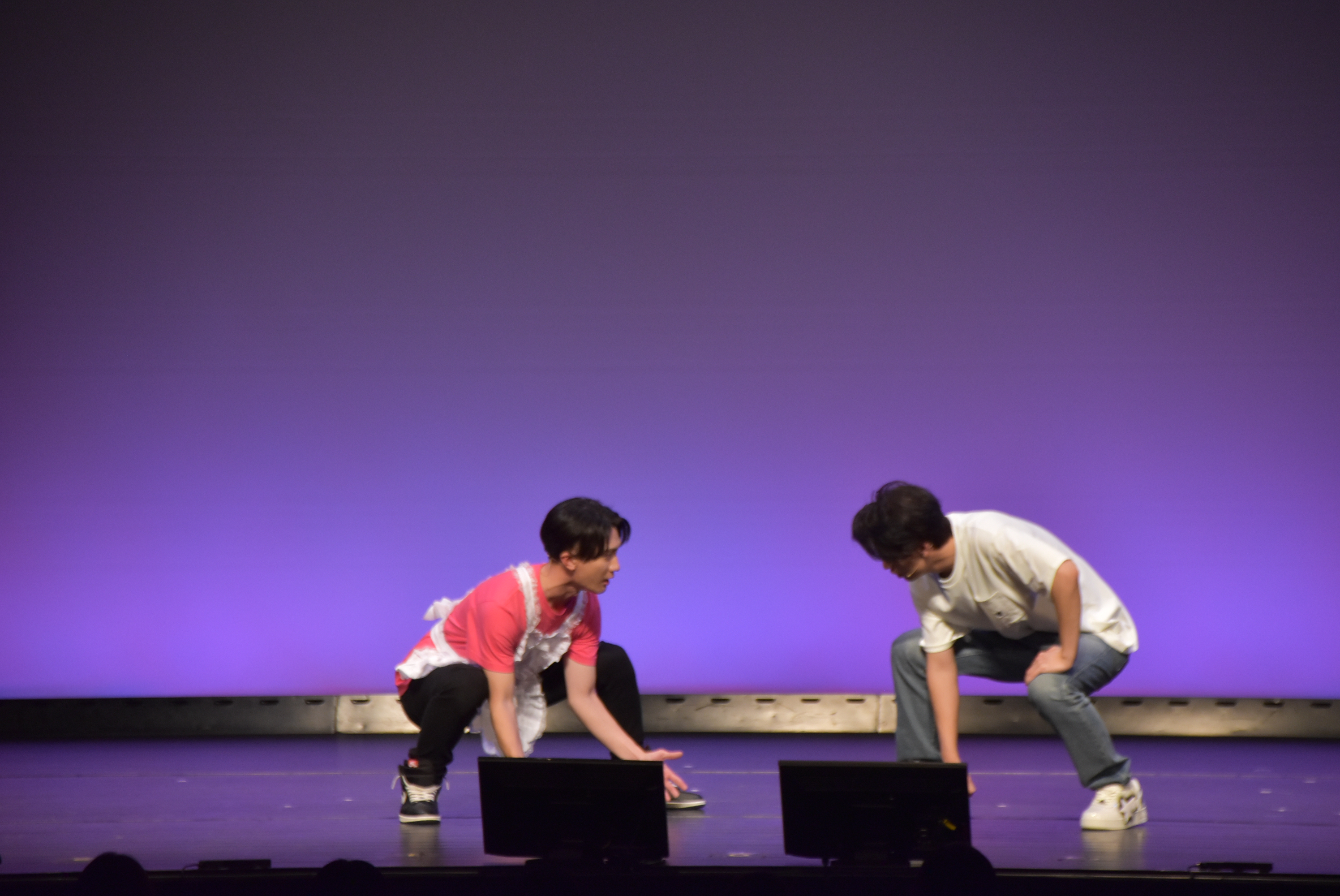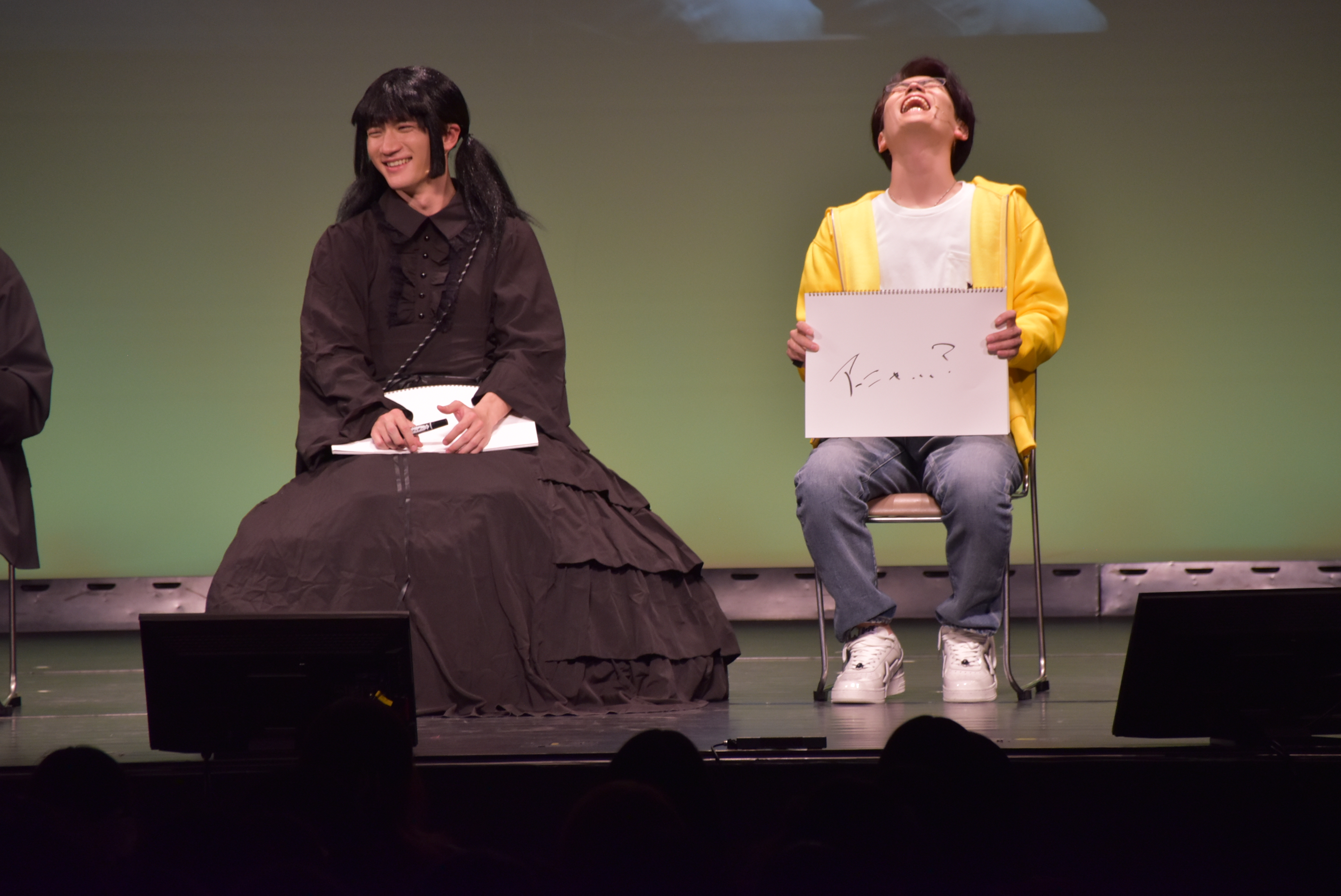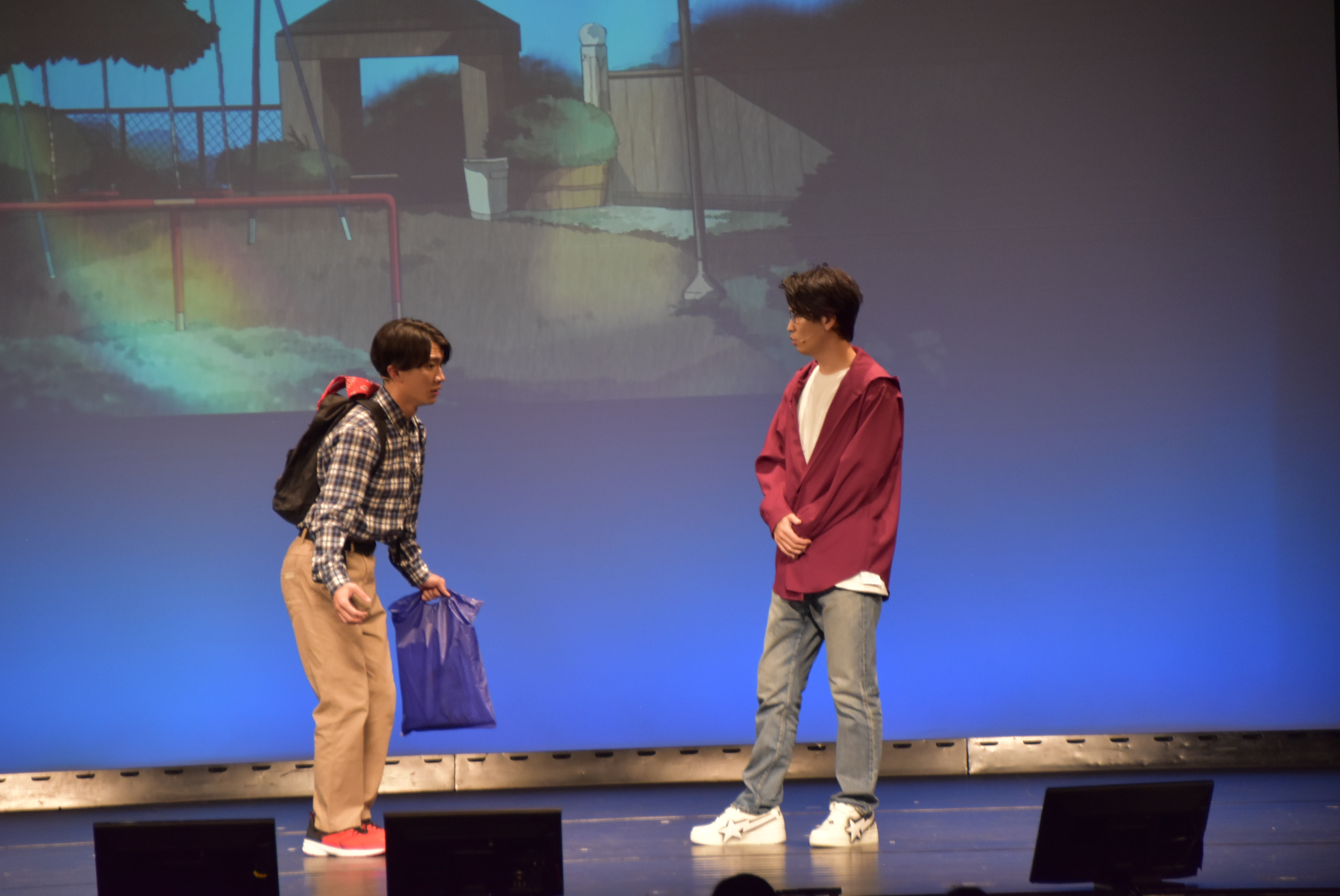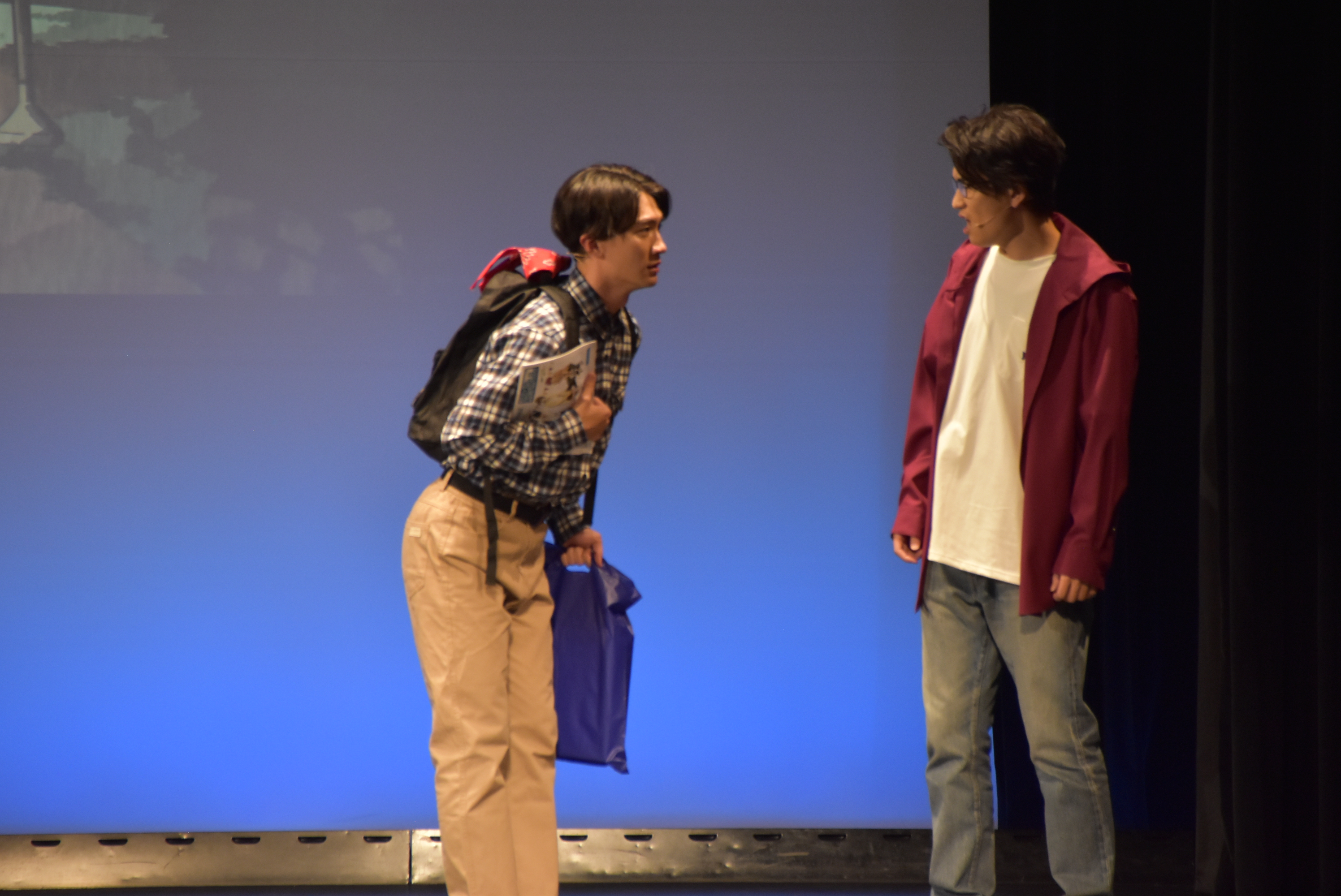 狛江はアニメの聖地であるこの場所に感激して「これ最高、もう死んでもいい!」と言い放つが、喜多見は黒い服=喪服の彼女が言葉通りの行動をするのではと勘違いして「早まらないほうがいい」と心配。一方の狛江は、喜多見の青と黄色の服を推しアニメの“概念コーデ”だと信じ込み、会話はすれ違ったまま続いていく。「推す」と「押す」を取り違える軽快なやり取りや、「しんどい」と共感しあう二人の言葉の意味合いが全く異なることが明らかになっていく展開に、客席は肩を震わせ続けた。