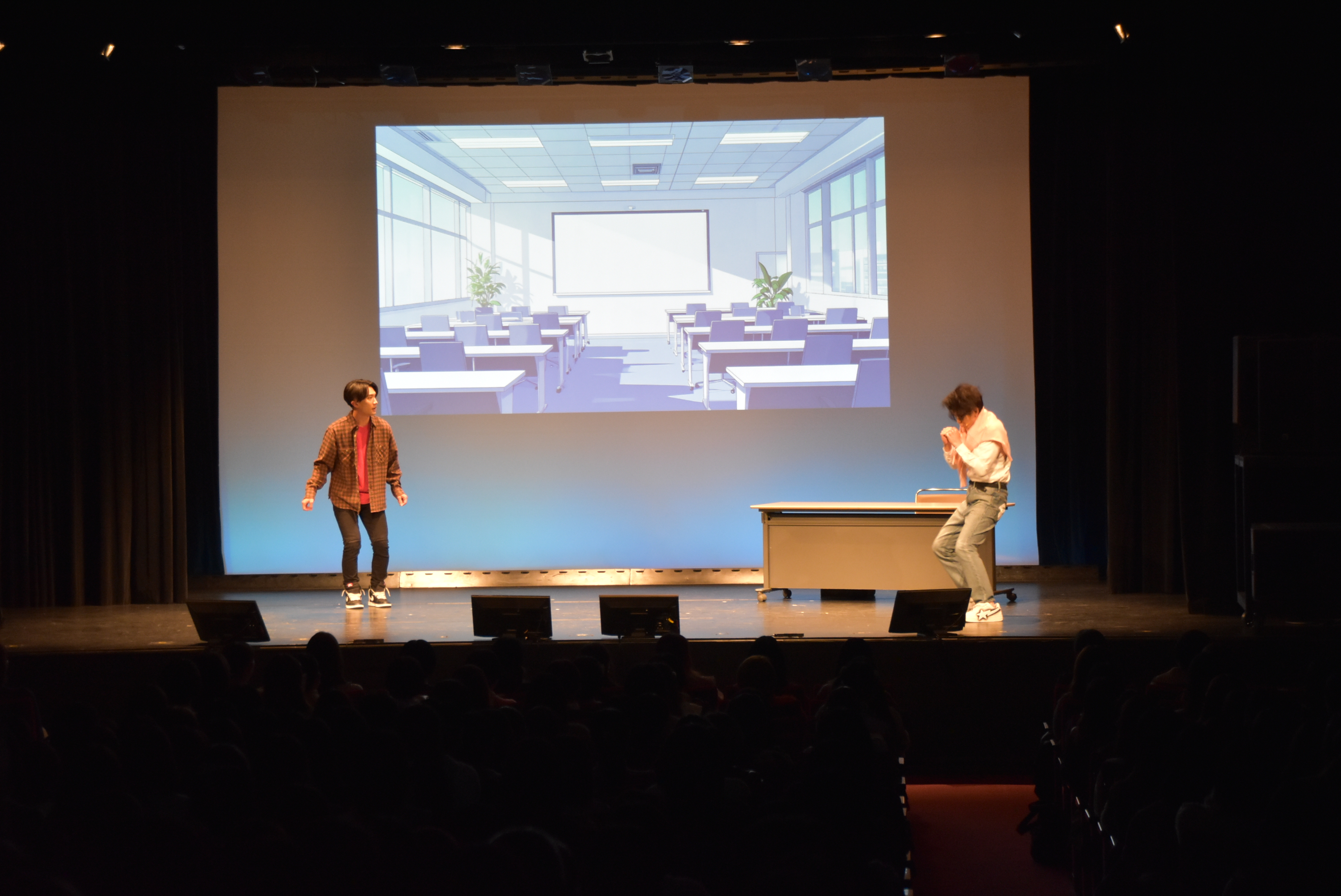 「今、西暦何年ですか」「2025年ですけど」という会話から、熊谷演じるオタク格好の人物が10年前からタイムマシンでやってきたことと主張。「2015年のきゃらびい(情報誌)」「進撃の巨人!巨人中学校のフィギュア」などのレアアイテムを持っていることに驚く阿座上の反応に会場は笑いに包まれた。