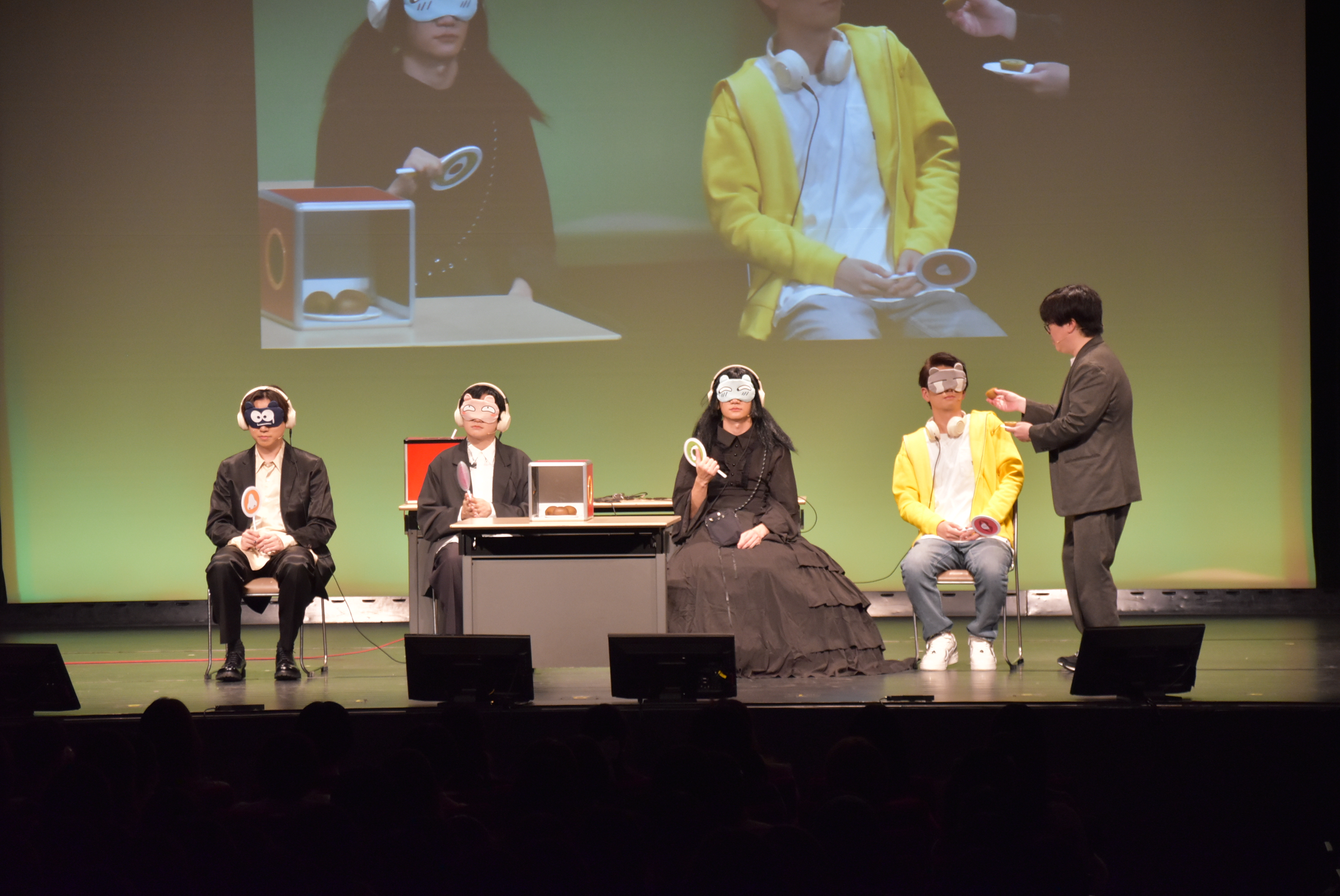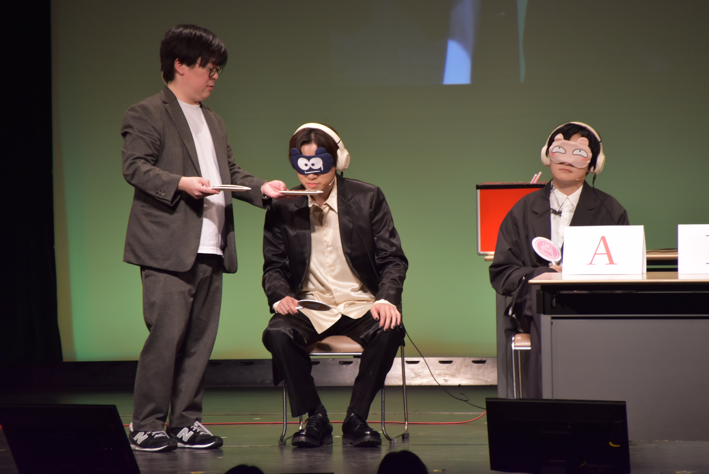 会場が大きく沸いたのは、次に有利な「味覚」を引いた阿座上さんのターン。手を使わず、MCの飯大郎さんにその物体を食べさせてもらうことになったのだ。「すごい背徳感が……」と飯大郎さんがつぶやきながら口元へ運ぶと、会場からは黄色い悲鳴交じりの歓声が飛び交う。