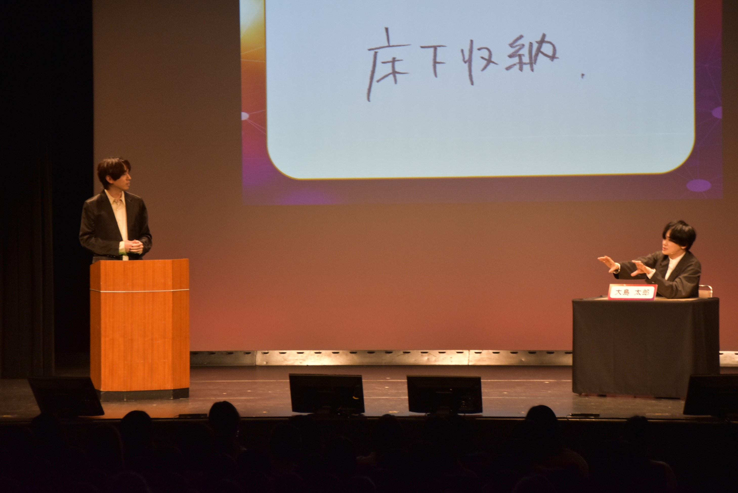 極めつきは「オリジナルの四字熟語を教えてください」に対する答えが「床下収納」。ツッコミどころ満載の内容に「梶原岳人はヤバいやつだった」という結論に至り、場内はどよめきと爆笑の連続だった。