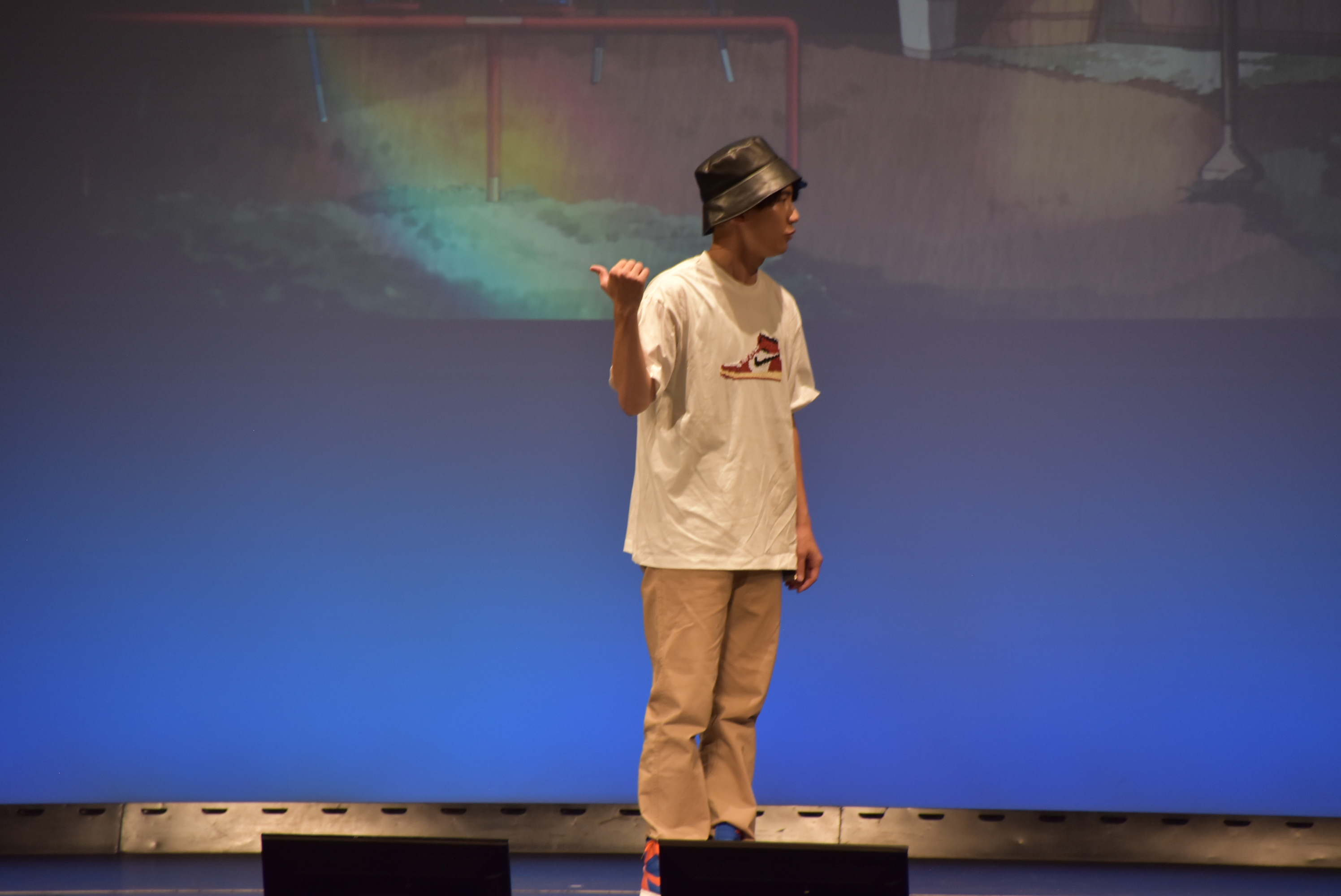 電話の相手と思われる大御所先生からの無茶ぶりも、「先生は鬼か!?」と仲の良さを垣間見せる喜多見。その対応を見た狛江は一転して「僕が間違っていました!ついていきます!」と熱い眼差しを向ける。すると喜多見は、「ウーバーイーツ」のようなリュックを背負い、「さあ行くぞ狛江くん!焼肉弁当をピックアップして納品だ!」と、まさに「運び屋」の仕事へ出発。そしておもむろに巨大なサンバイザーを装着し、まさかの「スーパーサンバイザー」の登場というオチに、客席からは納得と驚きの声が上がった。