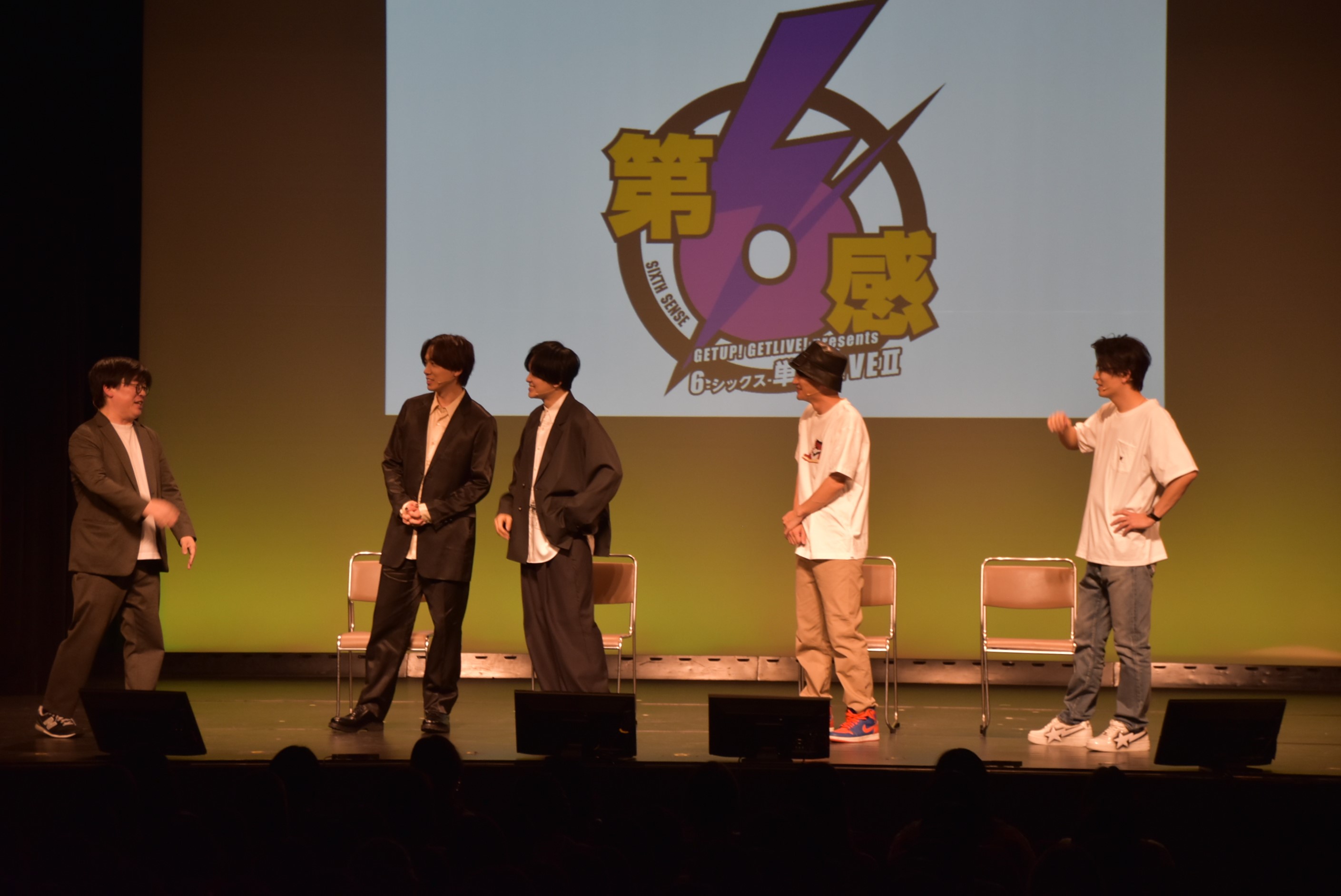 本イベントは、声優が二次元のお笑い芸人を演じるプロジェクト「GETUP! GETLIVE!(ゲラゲラ)」コントコンビ『6-シックス-』の喜多見蓮(CV:阿座上洋平さん)と狛江一馬(CV:熊谷健太郎さん)による単独ライブの第2弾。ゲストには、『はやしま』の早島雷(CV:天﨑滉平さん)と早島央(CV:梶原岳人さん)、MCには天津飯大郎さんを迎え、熱いステージが繰り広げられた。